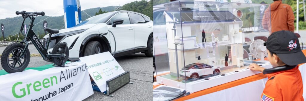 今回の自転車祭では、メイン会場に出展したグリーンアライアンスのブースも大きな注目を集めました。まず、ブース横にはエコフレンドリーなモビリティである日産の電気自動車「アリアB9」を展示。91kWhのバッテリー容量を持つこの車を電源として、電動キックバイク「First Rider」に給電を行い、エネルギーのスマートな流れの実演展示を行いました。また、Re.RISE®シリーズの防眩太陽光パネルをはじめ、Q.READY®のパワコンや蓄電池ユニット、V2Hシステムなど、ハンファジャパンの人気商品と共に、これらを活用したスマートハウスの仕組みがわかる電飾ジオラマを展示。ブースには子どもから大人まで大勢が立ち寄り、ジオラマなどに実際に触れ、再生可能エネルギーと、その流れなどを体験。楽しみながら、クリーンエネルギーの可能性について興味を持ち、理解を深めた様子でした。