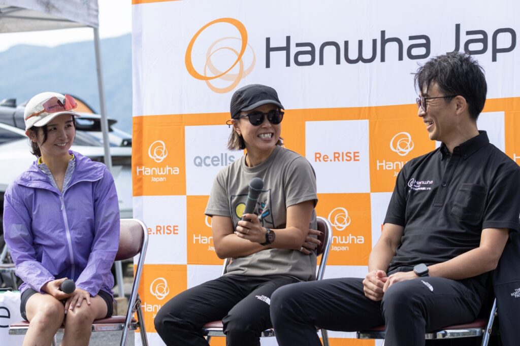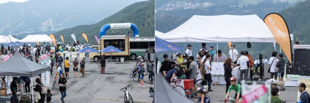 午後にはグリーンアライアンス事務局代表 李泰基氏(ハンファジャパン株式会社 エナジーソリューション事業部長)と、プロフリースキーヤーの小野塚彩那氏、プロスノーボーダーの田中幸氏によるトークショーも。「フィールドを楽しむために私たちができること」をテーマに、スノースポーツを通して実際に感じている地球温暖化に対しての危機感や、地域や自然との共生、未来に向けてやるべきこと、などについて語りました。李代表からは「豪雪地帯でスキー場として有名な野沢温泉でも、確実に温暖化の影響がでている。グリーンアライアンスは、これを重要課題ととらえ、少しでも環境維持に向けたお手伝いができればと活動しています。自転車祭後援もそのひとつ。ひとつひとつは小さなことですが、私たちのアクションを通じてより多くの人にメッセージを届けていきたい」と語りました。