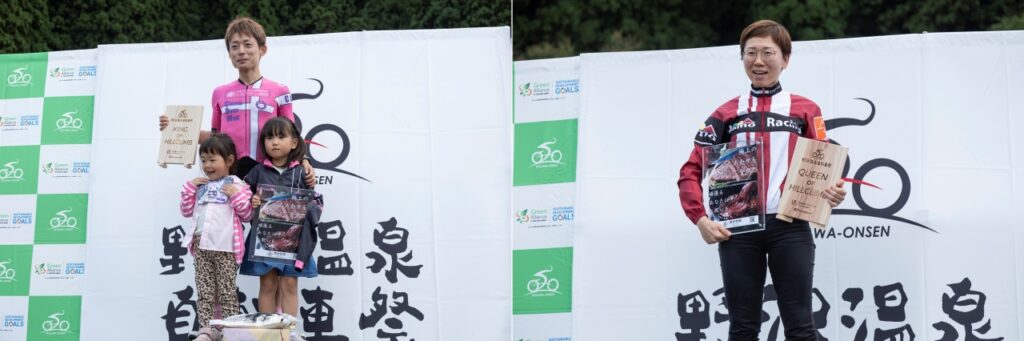 初日の最後は、「ヒルクライム」競技の表彰式が行われました。部門別に表彰台に入賞者が登場。和気あいあいとした雰囲気の中、木製メダルと地元の特産品が授与されました。グリーンアライアンスのメンバーからもe-Bike部門で複数の入賞者が誕生しました。一般自転車のトップ選手の記録が35分24秒のところ、グリーンアライアンスチームのタイムは41分31秒から52分21秒まで。プロに迫る走りだけでなく、男女差があまり見られなかったことも印象的でした。誰もが平等に楽しめる――そんなe-Bikeの魅力が改めて感じられました。