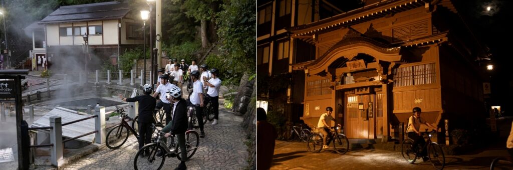 会議後には、参加者によるe-Bikeの試乗会が実施されました。e-Bikeは、グリーンアライアンスが「エコフレンドリーなモビリティ」として注目するもののひとつ。「野沢温泉自転車祭」実行委員会の協力により、10台以上のe-Bikeが用意され、「長野会議」出席者の多くが参加しました。温泉が湧きだす「麻釜」(おがま)や、外湯の「大湯」など、観光客にも人気のスポットを巡り、その乗り心地を体感。初めてe-Bikeを体験する参加者も多く、「グンと押されるような、ふわりと浮くような力強がある」「期待以上のパワー。上り坂も少しこぐだけで驚くほどスムースに進む」「車代わりに日常で活用してみたい」と、それぞれに感銘を受けた様子でした。さらに、夜は温泉街や、自転車祭に合わせて開催された「屋台村」なども巡り、伝統と新しい文化が共存する村の魅力を満喫しました。